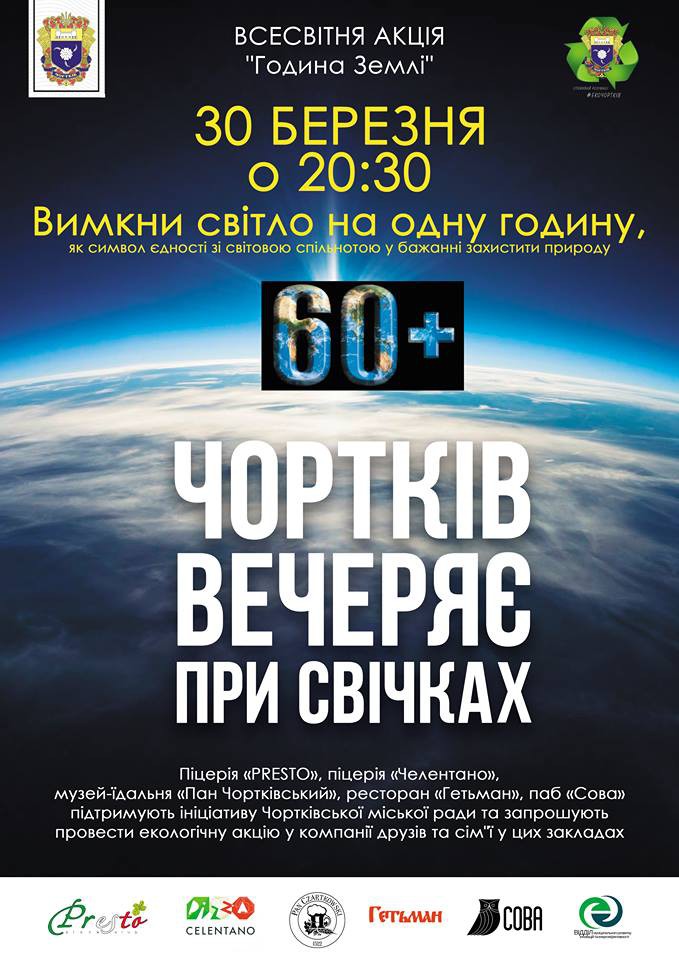 Минулого року у Чорткові у Годину Землі вимикали світло на центральних вулицях міста. Цьогоріч – заклади громадського харчування підтримали ініціативу Чортківської міської ради та запрошують провести екологічну акцію у компанії друзів та сім’ї, та повечеряти у цих закладах без світла, лише при свічках.