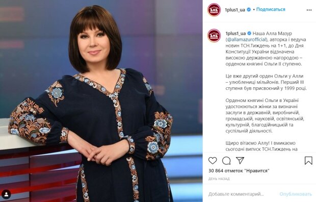 "Наша Алла Мазур, автор і ведуча новин ТСН.Тиждень на 1 + 1, до Дня Конституції України відзначено високою державною нагородою – орденом княгині Ольги II ступеня", – повідомила прес-служба каналу.