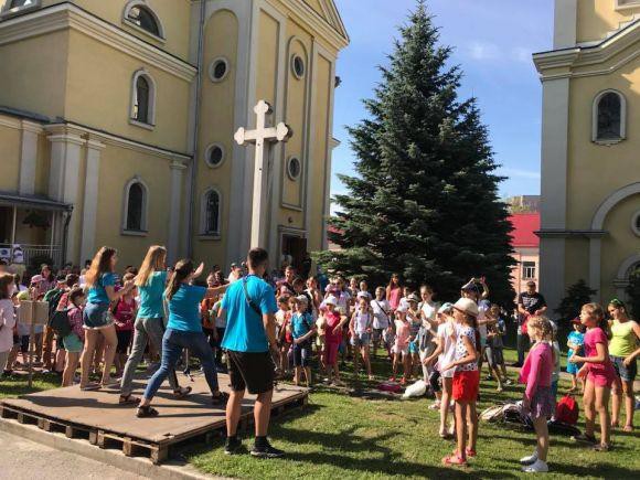 Учасники спільноти «Світло Марії», яка діє при храмі були аніматорами, які займалися з дітками впродовж 5-ти днів. Це 16-річні Марія Семерез, Ірина Табака, Ярослав Сухий, Анастасія Слота, Софія Заяць. - Наша мета – зробити благе діло, - каже Ярослав Сухий. – Тому ми вирішили стати аніматорами. - Попередньо у табір зареєструвались близько 200 дітей з різних парафій. Звісно, не всі прийшли, проте приходили нові, які спочатку не реєструвалися, - розповідає аніматор Ірина Табака. – Ми ділилися на групи за віковими категоріями. Жовта – це маленькі 5-7 років. Дорослі – 7-8 років, зелена команда. Найдоросліші 11-15 років – синя група. Наприклад одна команда мала 60 дітей. Де було багато, то ділили по половині – по 30 дітей. Щодня зранку о 9.30 – реєстрація, потім о 10.00 була Свята Літургія. Після цього разом з дітьми ми танцювали банси, грали ігри. А потім розходились по групах. Кожен аніматор мав свою групу і займався з нею або в класі, або в захристії чи в монастирі. У таборі були теми дня. Зокрема: «Жити», «Любити», «Бути для інших», «Бути собою», «Бути в царстві». Щодня аніматори розповідали щось до цієї теми, презентували відео та грали ігри. Також організовували різні квести. - Потім ми знову збиралися разом у церкві і співали пісні. У цьому нам допомагала сестра Софія, - продовжує аніматор Марія Семерез. – Під кінець дня збирались по групах, робили підсумок і була завершальна молитва. Ми думали, за що подякувати Богу і що попросити, молилися. Потім дітей забирали батьки. Аніматори розповіли, що «Канікули з Богом» - це багаторічна традиція Церкви Успення Пресвятої Богородиці, яку підтримують щороку, пише Джерело.