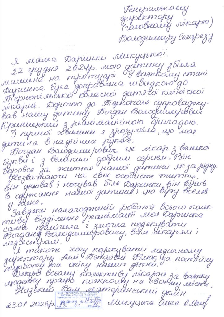 Особливо добре пам’ятає випадок завідувач відділення анестезіології та інтенсивної терапії Богдан Криницький, який очолював реанімаційну бригаду під час транспортування дівчинки з Кременецької ЦРЛ. Тоді Даринка перебувала у надважкому стані, і кожен день лікарі боролися за її життя, підтримуючи родину та не втрачаючи надії.