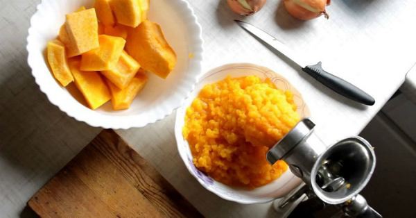 Постав м’якоть гарбуза в духовку запікатися. Залиш 100 г м’якоті на заливку, а решту відіжми через складену в декілька шарів марлю. Подрібни просушений гарбуз в блендері або м’ясорубці. Додай 70 г цукру, цедру, 2 яйця, 1 ст. л. крохмалю і гарненько перемішай.