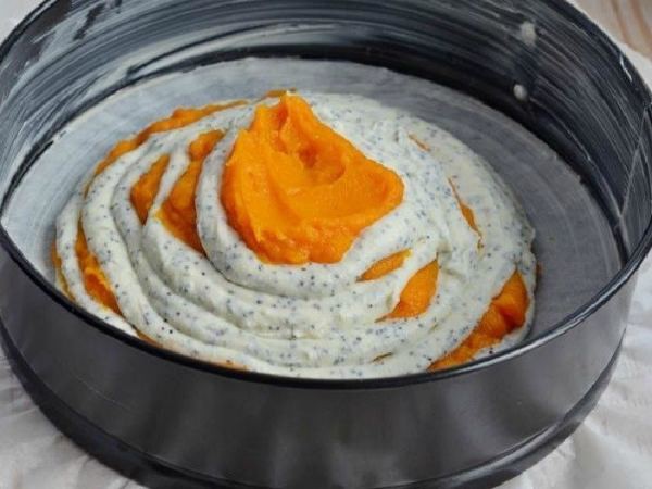 Застели дно форми (найкраще використовувати роз’ємну) пекарським папером і змасти маслом. Борти змасти теж маслом і посип невеликою кількістю борошна. По черзі викладай по ложці сирної маси і гарбузової.