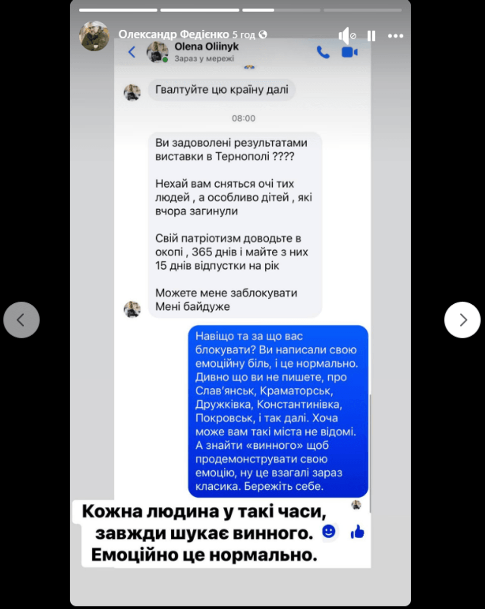 Тим часом Федієнко поширив у своїх соцмережах повідомлення, у якому його відео повʼязали з ударом по Тернополю, звинувативши в загибелі людей. Він прокоментував це так: «Кожна людина в такі часи завжди шукає винного. Емоційно це нормально».