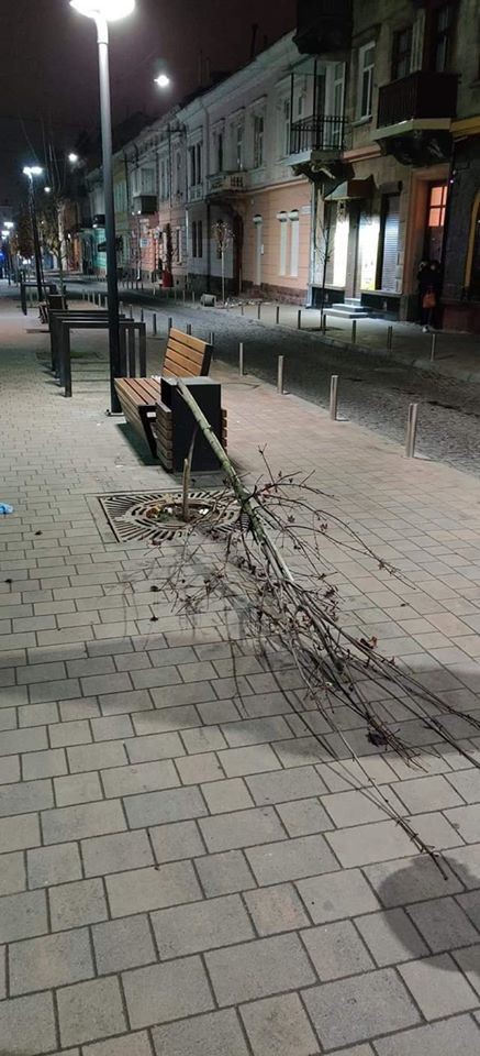 Фото опублікував тернополянин Тарас Ковальчук. Як з'ясувалось згодом завдяки камерам спостереження, дерево зламав п'яний чоловік, який ледь стояв на ногах.