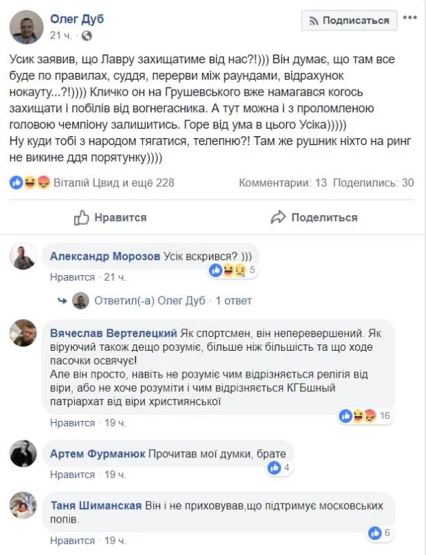 За словами Олега Дуба, якщо чемпіон світу з боксу Олександр Усик захищатиме ченців Києво-Печерської Лаври від нападів радикалів, то йому можуть проломити голову. Про це він написав на своїй сторінці Facebook у четвер, 13 грудня.