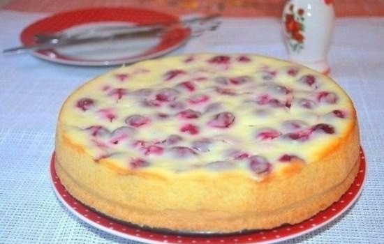 У змащену олією форму, вилити частину тіста. На тісто покласти кілька вишень без кісточок і нарізані тонкими пластинками яблука, зверху знову покласти кілька вишень. Зверху на яблука підсипати трошки цукру. Залишки тіста вилийте зверху. Випікати при 180 градусах близько 35-40 хвилин. Смачного!