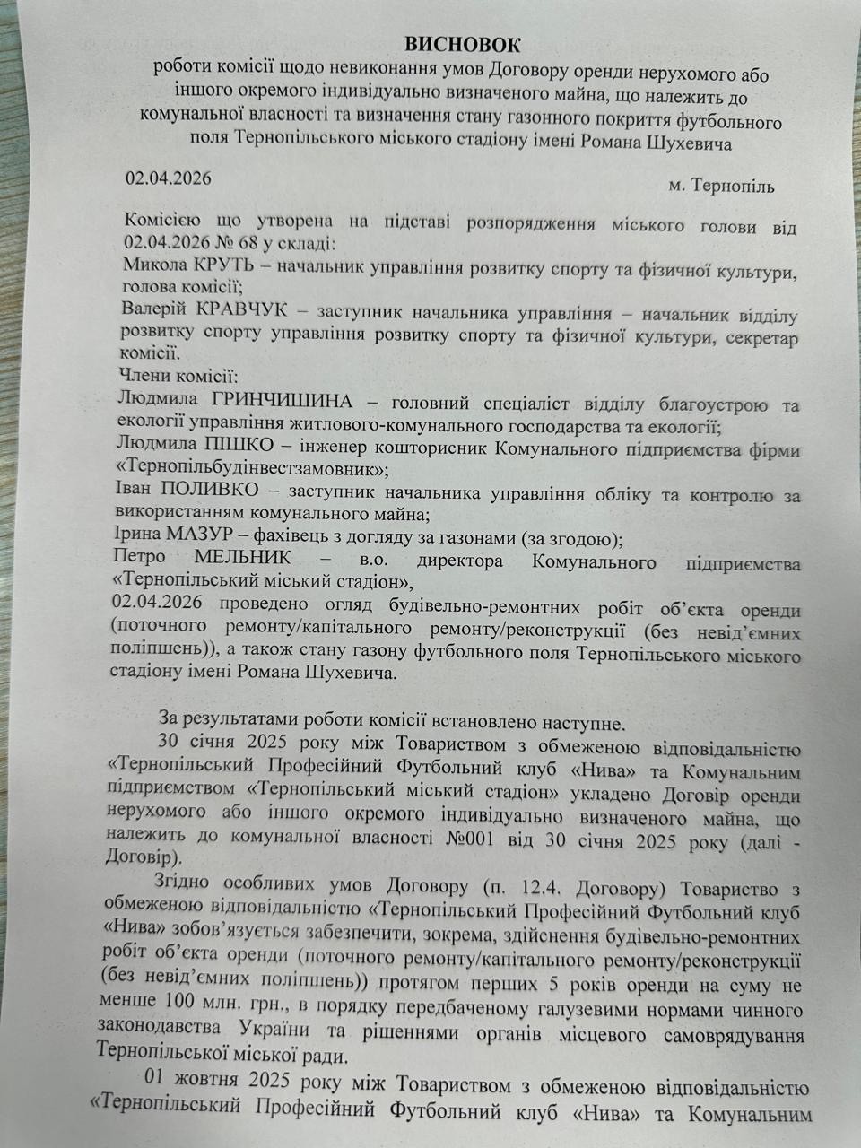 31 березня 2026 року клуб надсилає офіційний лист міському голові: «Орендар має намір припинити дію Договору оренди шляхом його розірвання за взаємною згодою сторін». Підпис, печатка, вихідний номер.Інвестори стверджують, що міська влада безпідставно не погоджуються проведення футбольних матчів. Але факти вперта річ - підстави є три -відсутність договорів щодо укриттів (і це в той час, коли Тернопіль під час обстрілу 19 листопада 2025 року втратив більше 40 невинних життів), незадовільний стан газону (висновок комісії з фахівцем), проведення попереднього матчу без дозволу. Лист «інвесторів» ігнорує всі три.