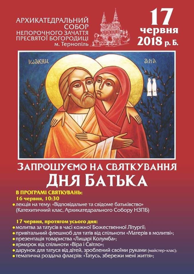 -17.06 о 13:30– дарунок для татуся від дітей своїми руками, майстер-клас, привітальний флешмоб, ярмарок,тематична роздача флаєрів для Татусів «Татусь, збережи мені життя», біля Архикатедрального Собору УГКЦ.