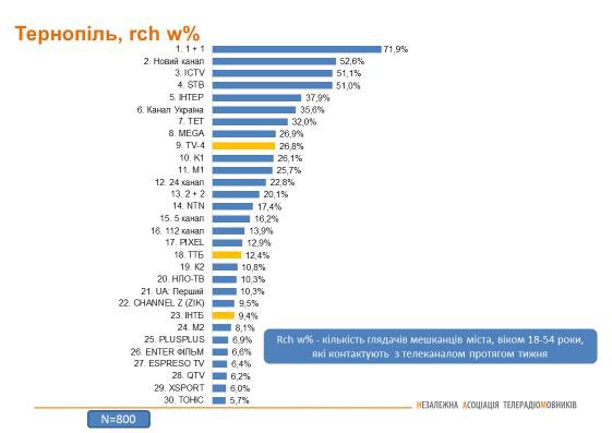 У Тернополі серед регіональних компаній за тижневим охопленням перше місце посідає TV-4 (26.8%), друге – TTБ(12,4%), третє IHTБ(9,4%).
