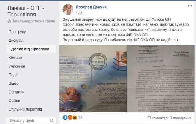 дописувачі у соцмережах пригадують панові Денчикові, що той ще у квітні писав у соцмережах про те, що коронавірус у Ланівці може привести лише отець Філюк. Що цікаво, пацієнт, який буквально днями вирвався з тенет коронавірусу став ініціатором “розборок” на всі фронти: “Ярослав Денчик Тепер вже з трьома приходиться боротися в судах: з