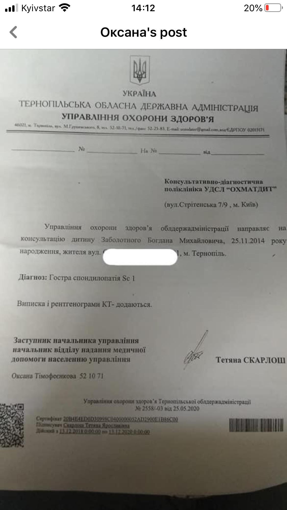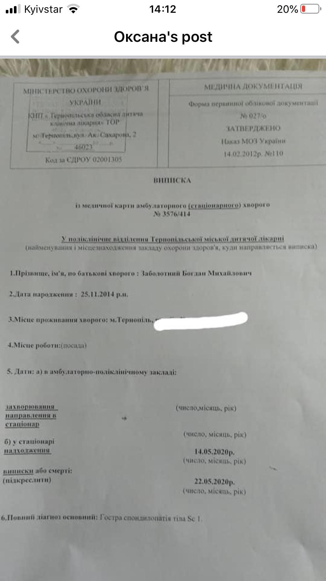"З моєю дочкою в садочок ходить хлопчик Богданчик,він круглий сирота,доглядає бабуся. Зараз у нього проблеми зі здоров’ям , з Тернополя їх відправляють на лікування в Київ. У бабусі немає зовсім коштів. Ми в групі зібрали гроші, але це просто мізер."