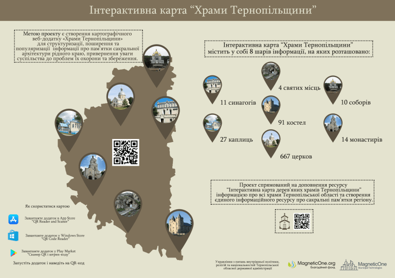Публічний картографічний веб-додаток відображає розташування всіх храмів Тернопілля на одній електронній карті та доступний з будь-якого пристрою, під’єднаного до мережі інтернет. Карту розробили благодійний фонд MagneticOne.Org спільно з MagneticOne Municipal Technologies, пише ДОБА
