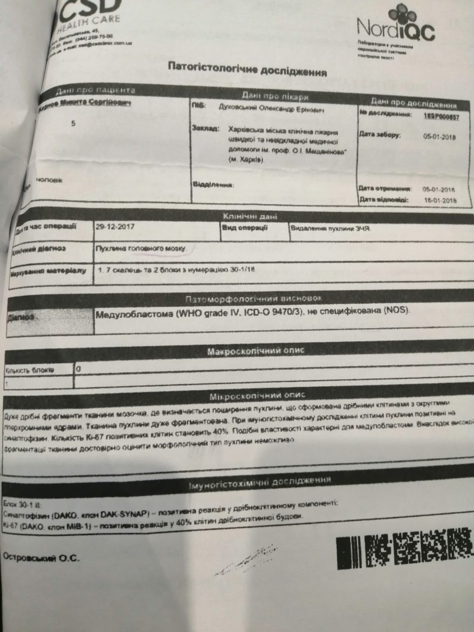 – У веселого здорового хлопчика, який ходив до дитсадка і виступав на ранках, з’явилася похитування при ходьбі і безпричинна блювота. В одній із лікарень Харкова на МРТ виявили солідну пухлину головного мозку, яку потрібно було терміново видаляти, оскільки вона тиснула на життєво важливі органи. Нейрохірургам вдалося максимально видалити пухлину, – продовжує пані Оксана. – Далі були важкі 14 днів реанімації. Як показала гістологія, пухлина була злоякісною (медулобластома).