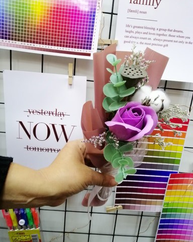 — Робота з мильними квітами досить проста та приємна. Не потрібно спеціальних знань та навичок, лише трошки натхнення, фантазії та гарного смаку. Для того, щоби створити композицію, необхідні: коробка, оазис, дерев'яні спажки або флористичний дріт, тейп-стрічка, декоративний папір та пів години вільного часу.