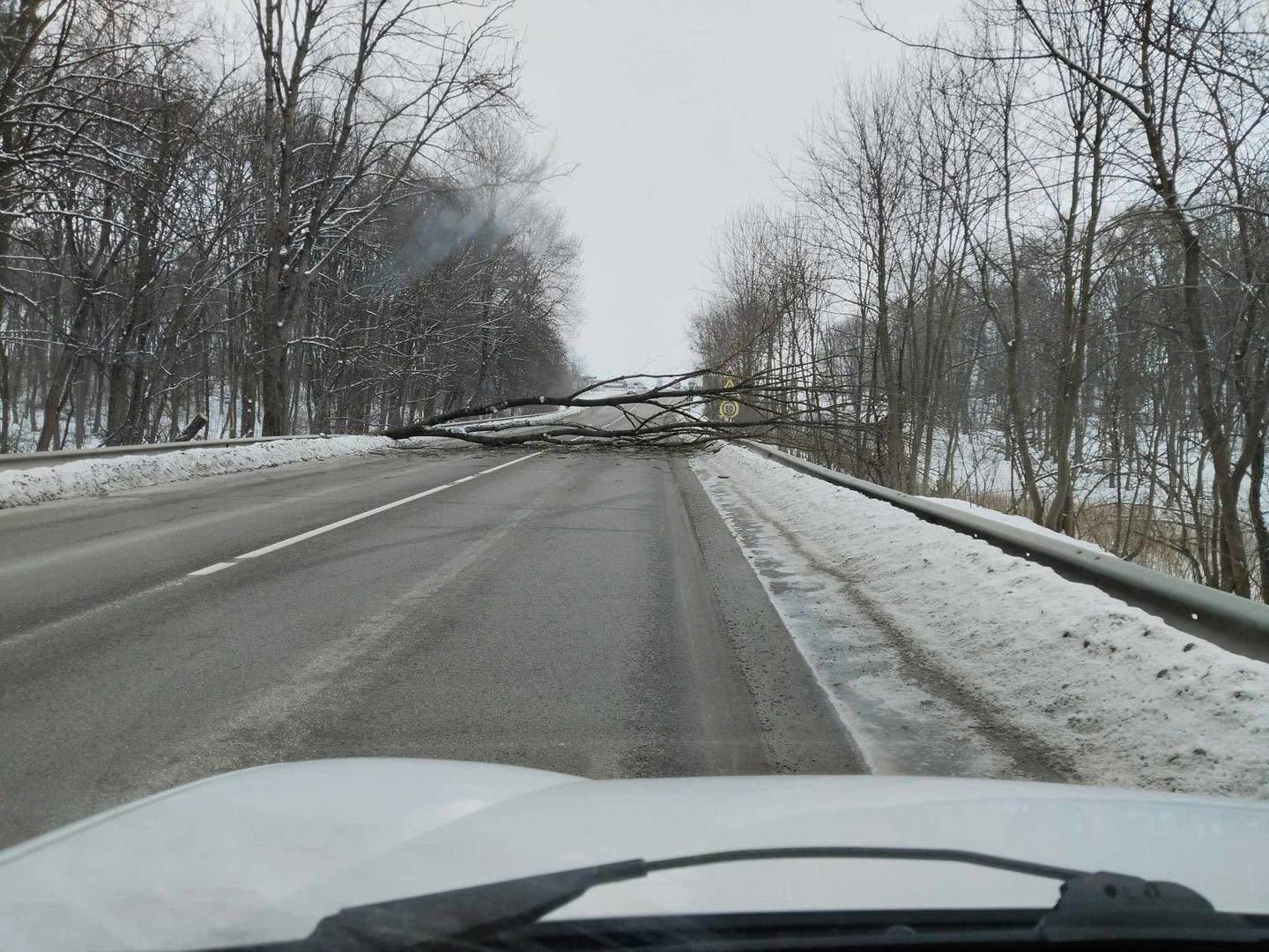 Інцидент стався посеред дороги — стовбур та гілля перекрили обидві смуги руху. Ймовірною причиною падіння могли стати сильний вітер або налипання мокрого снігу.
