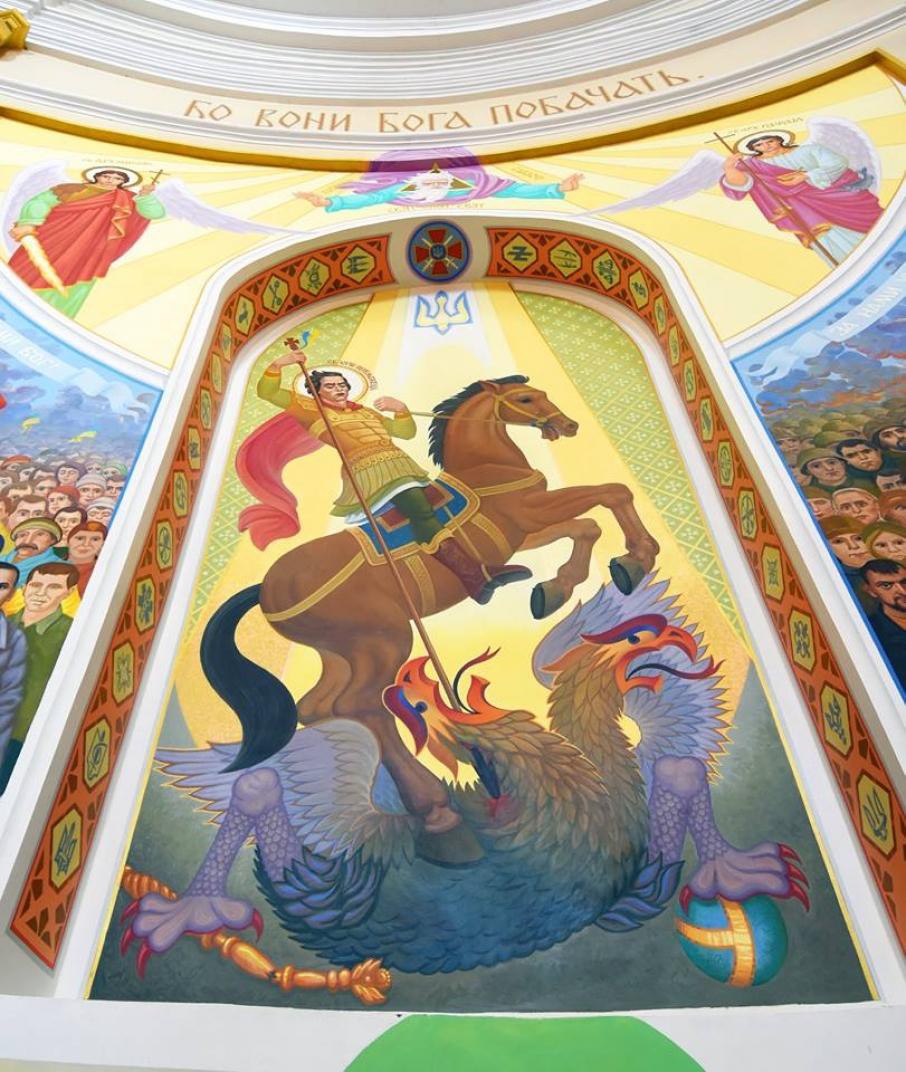 Українська війна є визвольною, а не загарбницькою, тому її благословляє Господь, кажуть у храмі. Творіння іконописця Василя Стецька викликало обговорення у мережі ще до завершення роботи. У фейсбуці під світлинами образу одні висловлюють захоплення, інші – називають його неканонічним.
