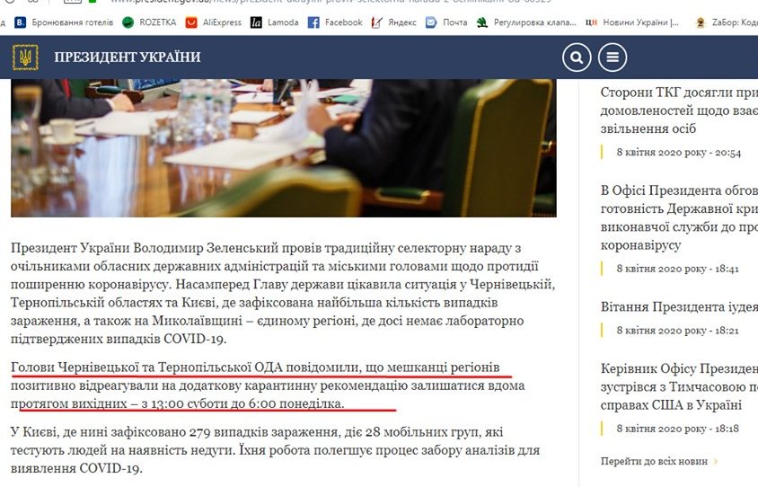 “Президент України Володимир Зеленський провів традиційну селекторну нараду з очільниками обласних державних адміністрацій та міськими головами щодо протидії поширенню коронавірусу. Насамперед Главу держави цікавила ситуація у Чернівецькій, Тернопільській областях та Києві, де зафіксована найбільша кількість випадків зараження, а також на Миколаївщині – єдиному регіоні, де досі немає лабораторно підтверджених випадків COVID-19.