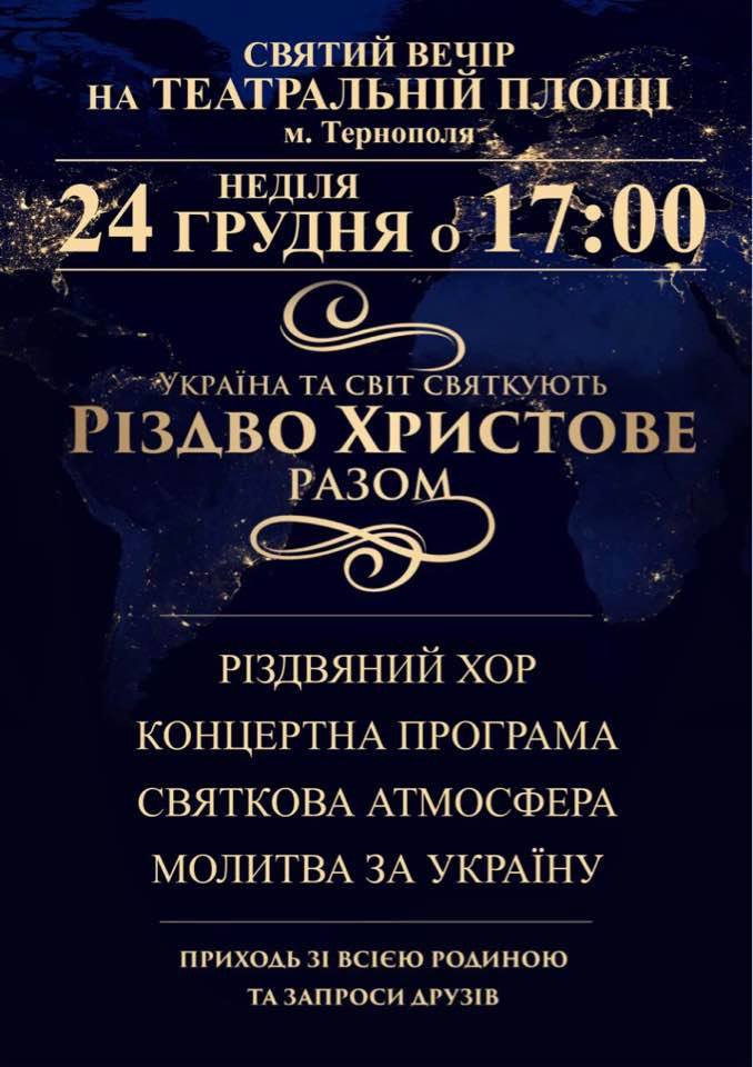 24 грудня о 17.00 на Театральному майдані тернополяни та гості міста матимуть можливість переглянути Різдвяний мюзикл «Хто ти?» у виконанні акторів-аматорів. Також у програмі запланована молитва за Україну, різдвяні пісні та концертна програма.