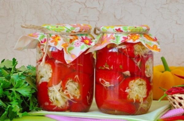 У перцю вирізати плодоніжки і насіння, і витримати в окропі 3-4 хвилини. Наповнюємо стручки перцю капустою і щільно укладаємо в банки, кладемо в банки по 1 лавровому листку і пару горошин запашного перцю, заливаємо киплячим маринадом. (1 л води, 1 ст.ложка солі, 100 г оцту).
