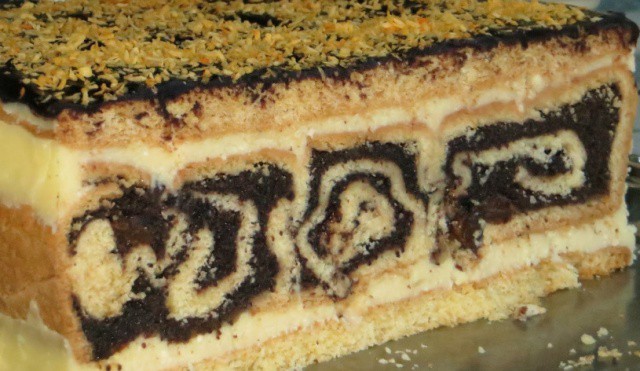 Корж змащуємо половиною гарячого крему, викладаємо корж з рулетів, змащуємо рештою гарячого крему, накриваємо другим коржем, поливаємо глазур’ю, зверху притрушуємо кокосовими пластівцями.