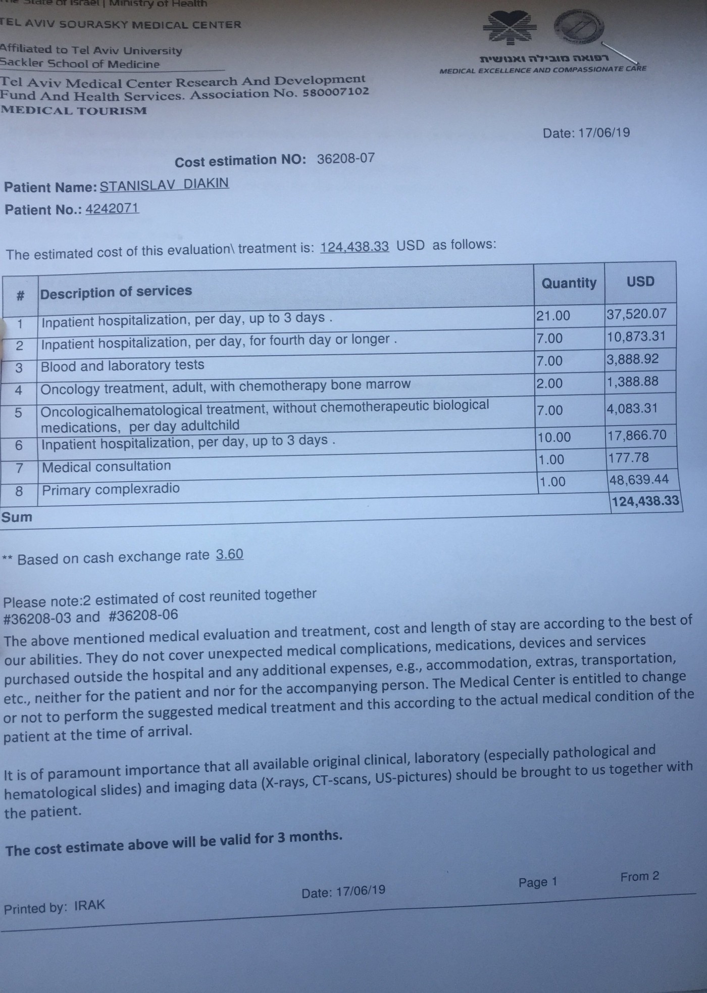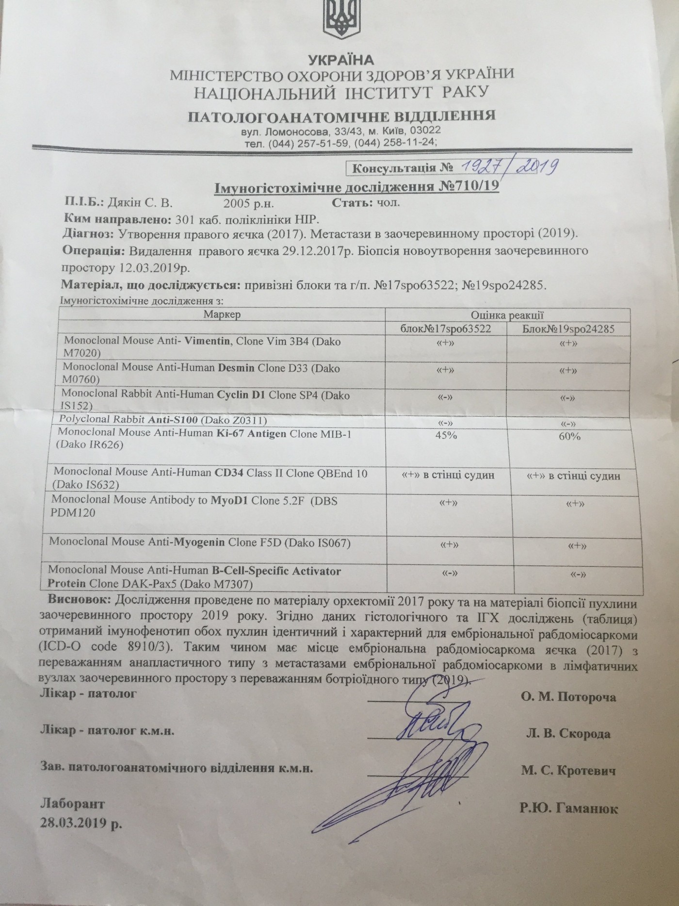 Син пройшов 5 хіміотерапій. Також 15.07.19 Стасу зробили дуже складну операцію по видаленню вражених лімфовузлів, після якої він за тиждень приступить до 5 хімії. Крім того, паралельно з хімією буде проводитись облучення. Лікування дає позитивні результати і надію на одужання. Проте ціни жахають…