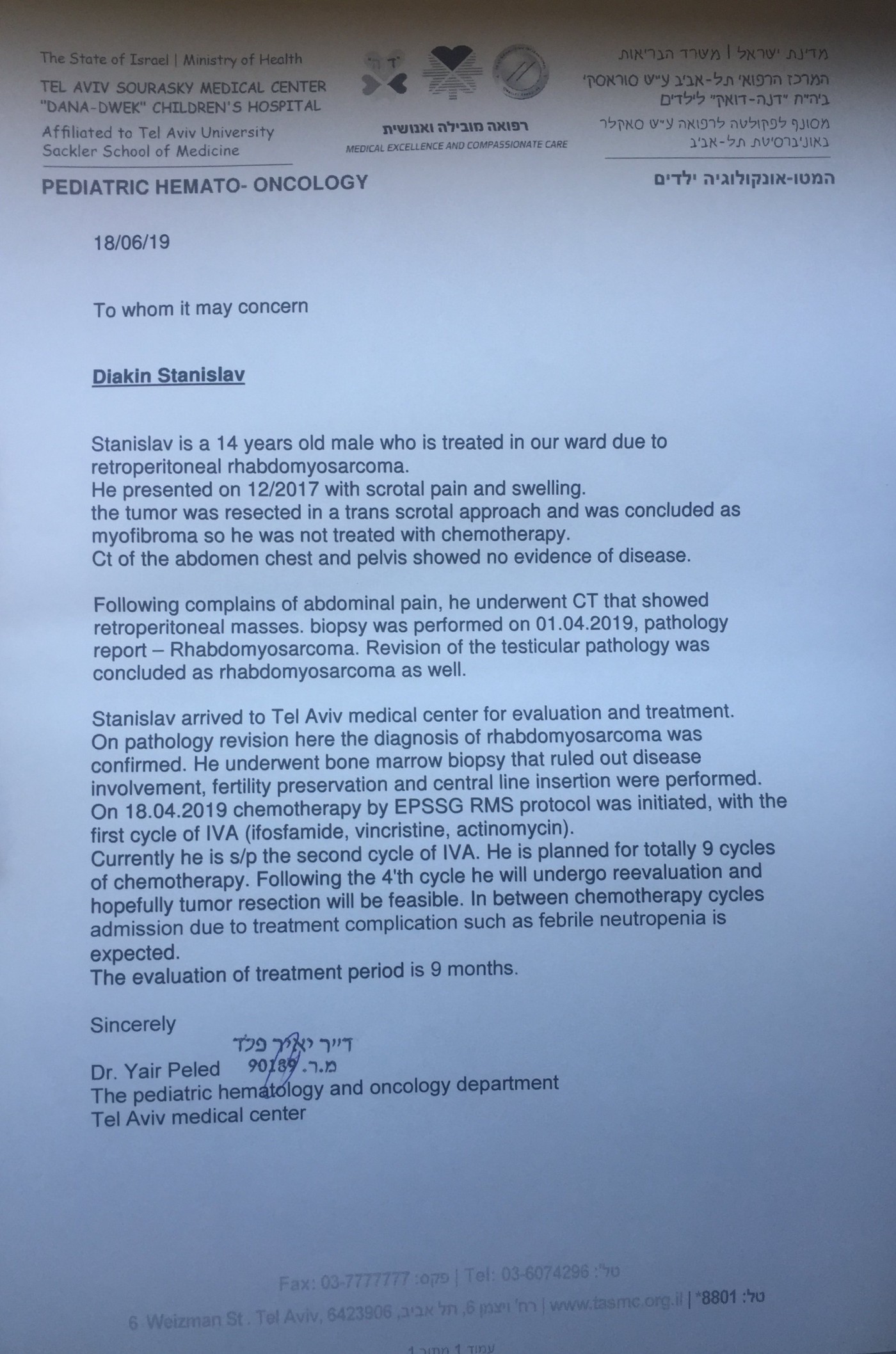 “Мій син Дякін Станіслав потребує негайної фінансової допомоги. Ми з села Горинка Кременецького району Тернопільської області. Стасу 14 років і він бореться з саркомою, яка пустила метастази в лімфовузли. Ми знаходимось на лікуванні в Ізраїлі.