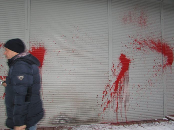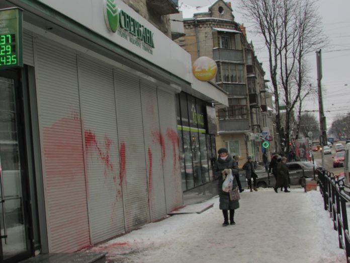 Російський банк у центрі Тернополя заляпали «кров’ю» (фото)