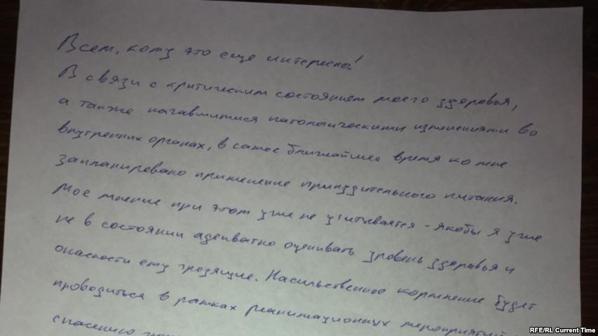 «У зв’язку з критичним станом мого здоров’я, а також патологічними змінами у внутрішніх органах, в найближчий час до мене заплановано застосування примусового харчування. Моя думка при цьому вже не враховується. Нібито я вже не в змозі адекватно оцінювати рівень здоров’я і небезпеки. Насильницьке годування буде проводиться в межах реанімаційних заходів з порятунку життя пацієнта. У цих умовах я змушений припинити своє голодування з завтрашнього дня, тобто з 6.10.18. 145 днів боротьби, мінус 20 кг ваги, плюс надірваний організм, але мета так і не досягнута. Я вдячний всім, хто підтримував мене, і прошу вибачення у тих, кого я підвів...Слава Україні!».