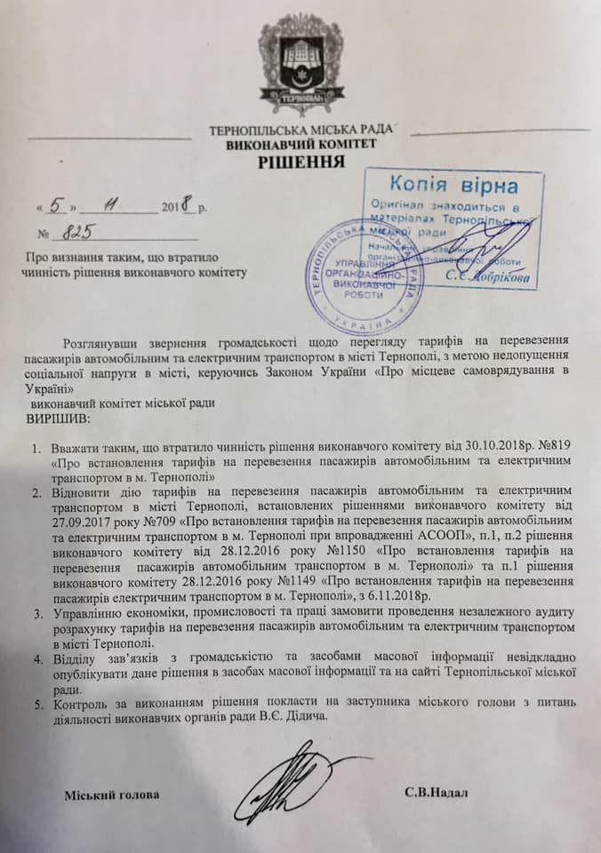 «Розглянувши звернення громадськості щодо перегляду тарифів на перевезення пасажирів автомобільним та електричним транспортом в місті Тернополі, з метою недопущення соціальної напруги в місті, керуючись Законом України «Про місцеве самоврядування в Україні» виконавчиу комітет вирішив:», – йдеться в преамбулі рішення.
