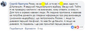 “Рома, ну не зай*буй, а то всі під*раси, один ти Д’Артаньян. Я – ведучий Національного відбору. Ве-ду-чий. Тобто, я не проводжу кастинги і не визначаю, кому співати, а кому ны. Для цього є окремо навчені люди”, – відповів Притула. При цьому він нагадав Скрипіну, що сам особисто говорив в ефірі, хто з учасників гастролює в Росії.