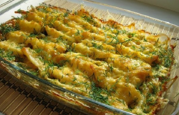 Відправляємо деко з картоплею в духовку, розігріту до 190 градусів, на одну годину. Після того, як дістали з духовки, посипаємо зеленню кропу. Смачного!