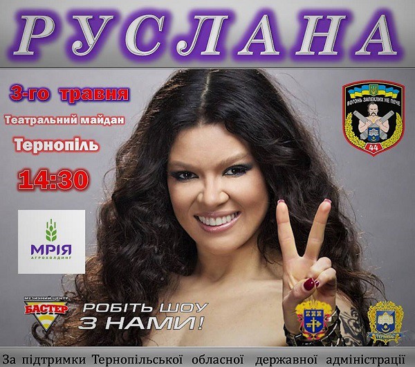 Продовжаться урочистості на Театральному майдані о 12.00 год. Крім вітань військовослужбовців, запланована дуже цікава та насичена програма, а також святковий концерт. Привітає наших бійців з поверненням додому й відома українська співачка, народна артистка України Руслана Лижичко! Концерт Руслани відбудеться на запрошення та за підтримки агрохолдингу «Мрія» та Тернопільської обласної державної адміністрації.