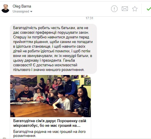 Скандальний народний депутат від БПП Олег Барна розкритикував багатодітну родину. Про це Барна написав у коментарі ІА “Вголос”. Барна назвав багатодітних батьків “немудрими” та засудив їх через критику Порошенка. Те, що родина немає грошей на розмитнення авто, нардеп вважає “совковістю”, а історію з розмитненням – “ідіотською ситуацією”.