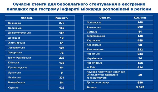 Всього до кінця року у регіони буде поставлено 20 000 стентів - як показує середня річна статистика, цього має вистачити, щоби надати безоплатне стентування всім, кого спіткав інфаркт та потребує термінової допомоги.