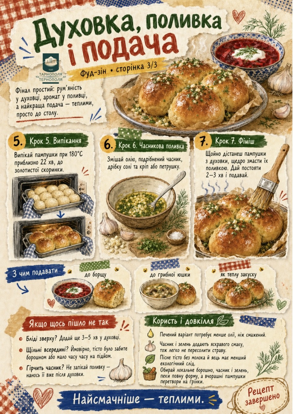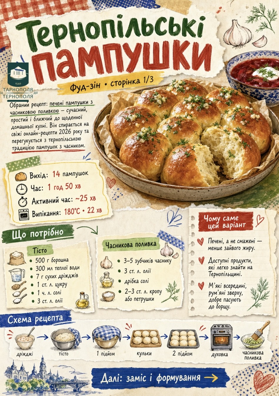 За основу взяли печені пампушки з часниковою поливкою — саме такий варіант сьогодні виглядає найбільш практичним для щоденної кухні: прості інгредієнти, зрозуміний процес і менше олії, ніж у смаженому форматі. Усередині — все без зайвого: що потрібно для тіста, як правильно зробити опару, скільки часу дати на підйом, як сформувати кульки, коли випікати і чим змащувати зверху, щоб пампушки вийшли м’які, рум’яні та ароматні. Основа рецепта — борошно, тепла вода, дріжджі, олія, сіль і цукор, а для поливки — часник, зелень та олія. Саме такий підхід зараз часто трапляється у свіжих кулінарних рецептах 2026 року. Додали і короткий контекст про користь та довкілля. Печений варіант потребує менше жиру, а пісне тісто без молока й яєць має менший екологічний слід. Плюс локальні продукти — борошно, часник, зелень — це проста й нормальна логіка для домашньої кухні Тернопільщини. Найголовніше, що цей рецепт не декоративний і не “для картинки”. Він робочий. Пампушки добре пасують до борщу, до грибної юшки або просто як тепла домашня випічка до столу. А найсмачніші вони, звісно, ще теплі. Смачного!