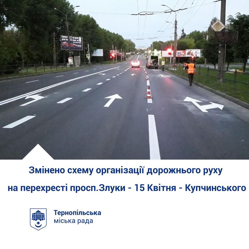 Нагадаємо, зі сторони вул. 15 Квітня (у напрямку до “Сільпо”) на проблемому перехресті нещодавно облаштували три смуги для руху: одна – виключно для повороту ліворуч, інша – прямо, а третя – прямо та праворуч. Також три смуги для руху зробили зі сторони церкви св. Михайла, одна з яких передбачає рух лише ліворуч на вул. Купчинського, середня смуга – прямо, а крайня права – прямо та праворуч. Змінили і режим роботи світлофорів, добавили лівоповоротні секції світлофорів (поворот з вул. 15 Квітня на проспект Злуки та вул. Купчинського) та стаціонарні правоповоротні зелені стрілки.