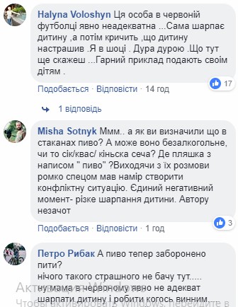 "Ммм.. а як ви визначили що в стаканах пиво? А може воно безалкогольне, чи то сік/квас/ кінська сеча? Де пляшка з написом " пиво" ?Виходячи з їх розмови ромко спецом мав намір створити конфліктну ситуацію. Єдиний негативний момент- різке шарпання дитини", " А пиво тепер заборонено пити? Нічого такого страшного не бачу тут.....Ну мама в червоному явно не адекват шарпати дитину і робити когось винним.....Так можна тоді усіх людей звинувачувати які на відкритих терасах п'ють а повз них проходять діти!!!", " І що це нормально? Діти повинні бачити маму порядною, хорошою господинею, щоб мати приклад у майбутньому для наслідування! А тут що? Змалку закладено, те що сидіти під магазином розпивати пиво і курити це нормально", - пишуть у коментарях.
