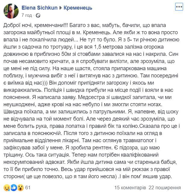"Я з 5-ти річною дитиною йшли з садочка по тротуару, і ця вся 1,5 метрова залізна огорожа довжиною в приблизно 50 м зі стовбами завалися на нас і накрила", – пише Elena Sichkun.