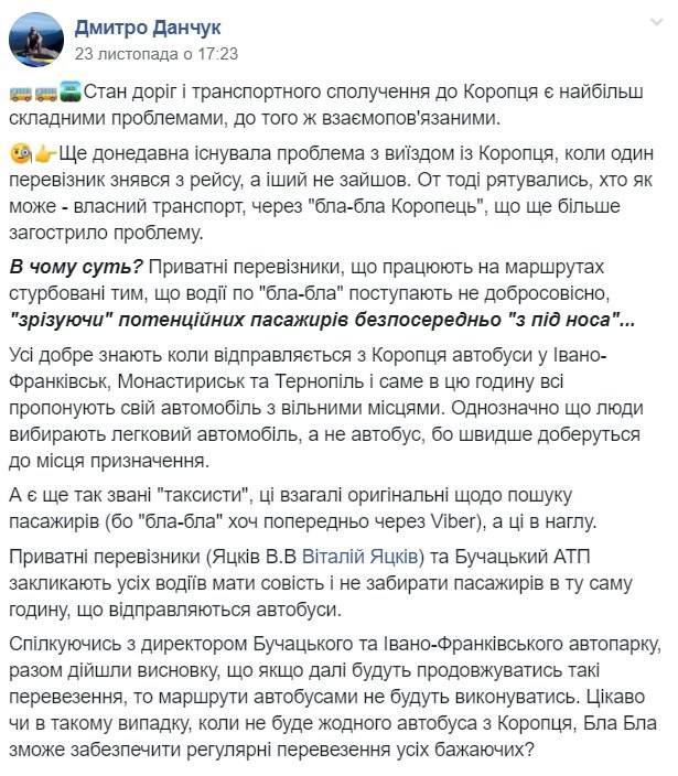 "Приватні перевізники, що працюють на маршрутах стурбовані тим, що водії по "бла-бла" поступають не добросовісно, "зрізуючи" потенційних пасажирів безпосередньо "з під носа"...", – пише Дмитро Данчук.