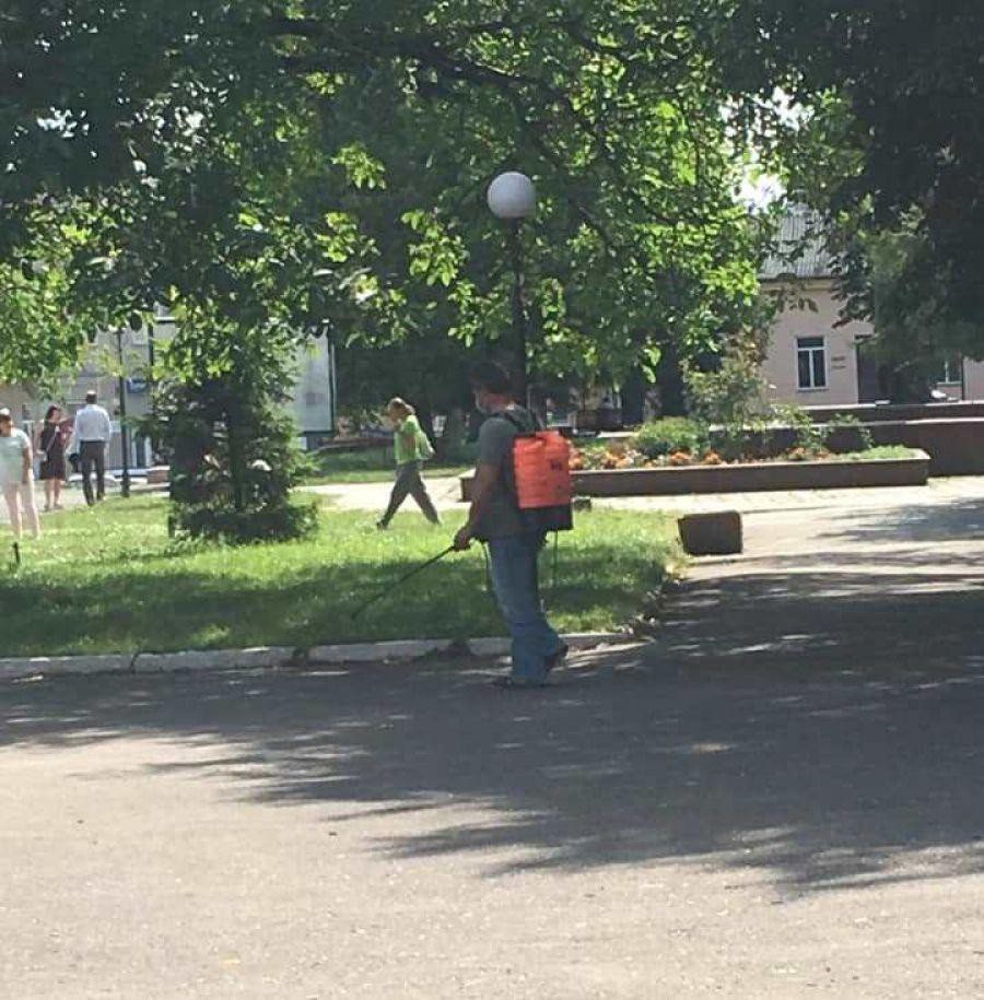 У центрі смт Козова, що на Тернопільщині, чоловік обприскує хімікатами траву.