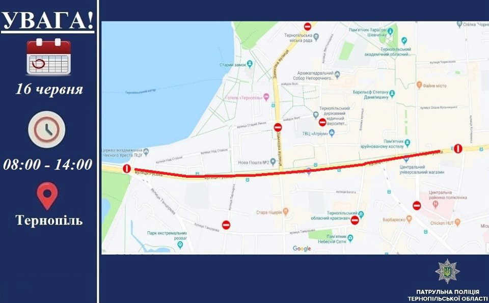 У зв’язку із проведенням заходу частково буде обмежено рух транспорту на вулиці Руська – набережна Тернопільського ставу – вулиця Білецька – вулиця Новий Світ – село Біла Тернопільського району – набережна Тернопільського ставу (вулиця Чумацька) – дамба Тернопільського ставу – вулиця Руська – Театральний майдан у період із 8-ї години ранку до 14:00.