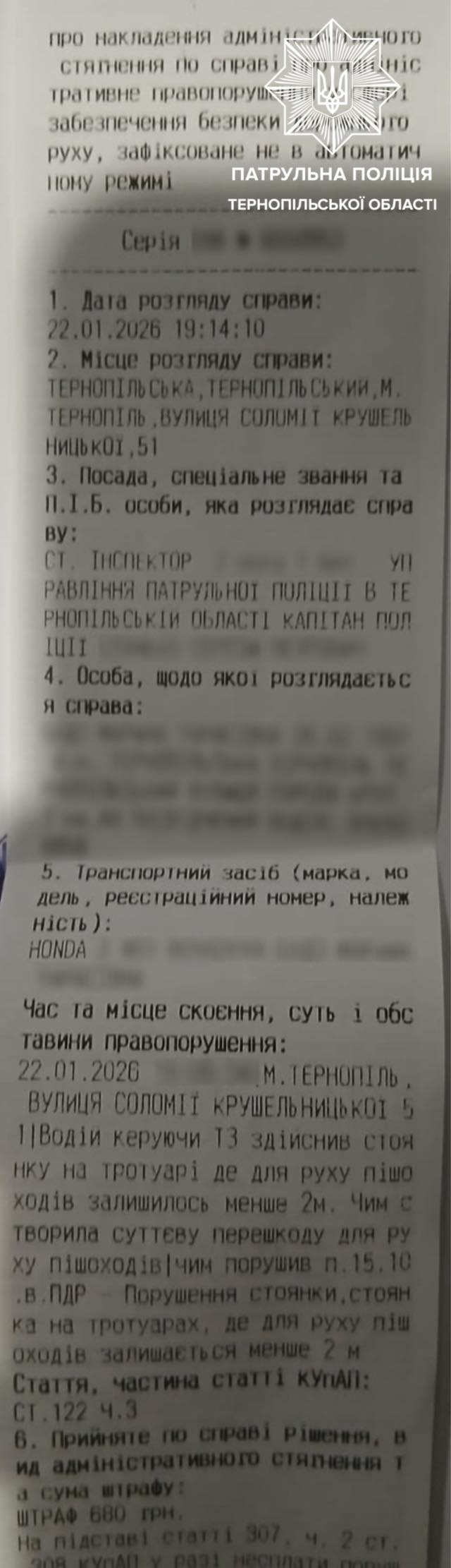 Учора ввечері на вулиці Соломії Крушельницької патрульні виявили автомобіль Honda, припаркований з заїздом на тротуар, що унеможливило безпечний прохід пішоходів.