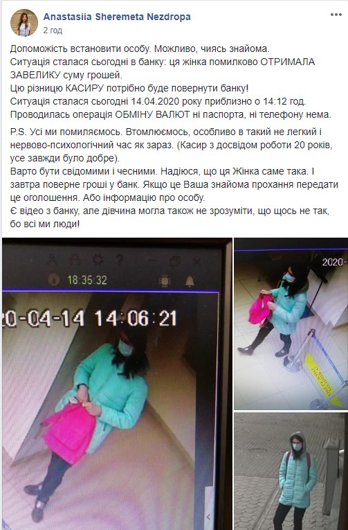 – Допоможіть встановити особу. Можливо, чиясь знайома. Ситуація сталася сьогодні в банку: ця жінка помилково ОТРИМАЛА ЗАВЕЛИКУ суму грошей. Цю різницю КАСИРУ потрібно буде повернути банку! Ситуація сталася сьогодні 14.04.2020 року приблизно о 14:12 год. Проводилась операція ОБМІНУ ВАЛЮТ. Ні паспорта, ні телефону нема. P.S. Усі ми помиляємось. Втомлюємось, особливо в такий не легкий і нервово-психологічний час як зараз. (Касир з досвідом роботи 20 років, усе завжди було добре). Варто бути свідомими і чесними. Надіюся, що ця жінка саме така. І завтра поверне гроші у банк. Якщо це ваша знайома, прохання передати це оголошення, або інформацію про особу. Є відео з банку, але дівчина могла також не зрозуміти, що щось не так, бо всі ми люди! – написала пані Анастасія.
