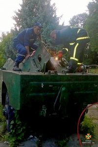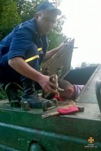 Рятувальники за допомогою спорядження відкрили люк бронетранспортера та дістали знесилену тварину.