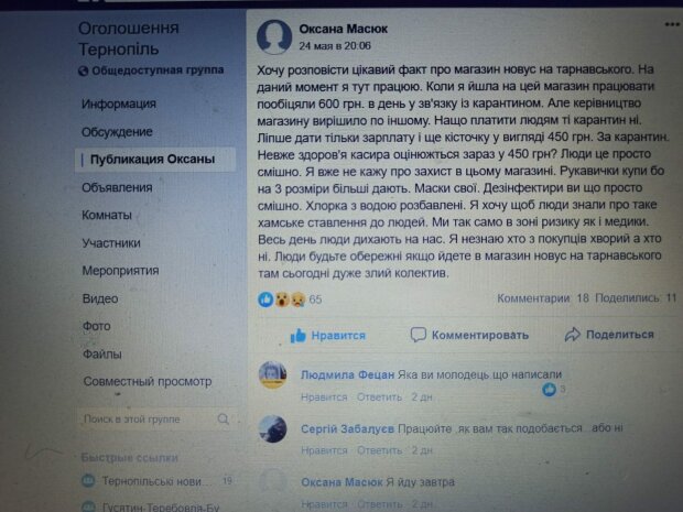 За словами Оксани Масюк в магазині не видаються засоби захисту, а оплата праці залишає бажати кращого. Вона зазначила, що при влаштуванні на роботу обмовлялося, що під час карантину зарплата буде становити 600 грн в день, а в реальності виплатили чисту зарплату і ще 450 грн.