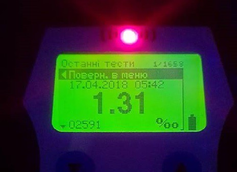 Тест на стан сп’яніння показав 1,32 проміле алкоголю в його крові, що є перевищенням допустимої норми. На водія патрульні склали адмінпротокол за ч. 4 ст. 130 КУпАП (вживання водієм транспортного засобу алкоголю після того, як транспортний засіб був зупинений на вимогу поліцейського) та винесли адмінпостанову за ч. 1 ст. 126 КУпАП (керування без відповідних документів).