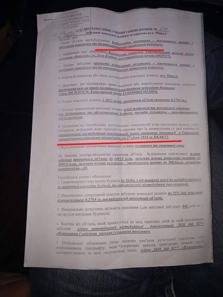 Причому надавались вони з особливим цинізмом, посилаючись на план зонування території міста Тернополя, але саме план зонування і забороняє будівництво житлового будинку на цій території. Ситуація повністю аналогічна із забудовою готельного комплексу на Бульварі С. Петлюри. Це черговий обман громади на догоду чиїмось приватним інтересам, а яку вигоду отримав із цього міський архітектор мають встановити компетентні органи, пише "ДемАльянс Тернопіль".