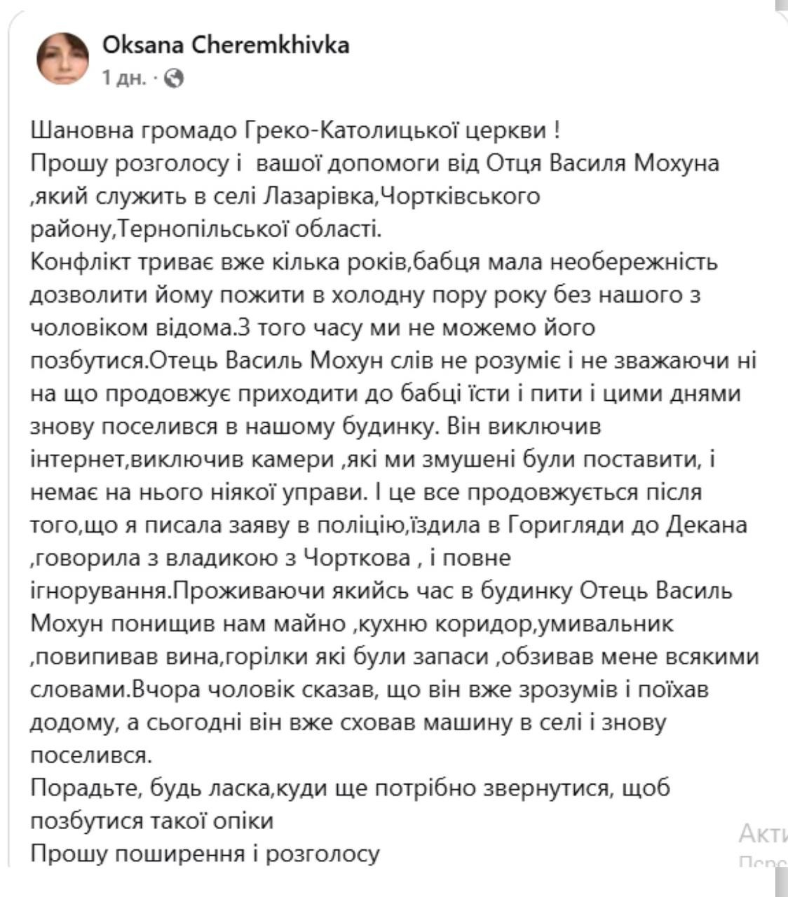 Відтак жінка через соцмережі звертається до громади УГКЦ вплинути на ситуацію.