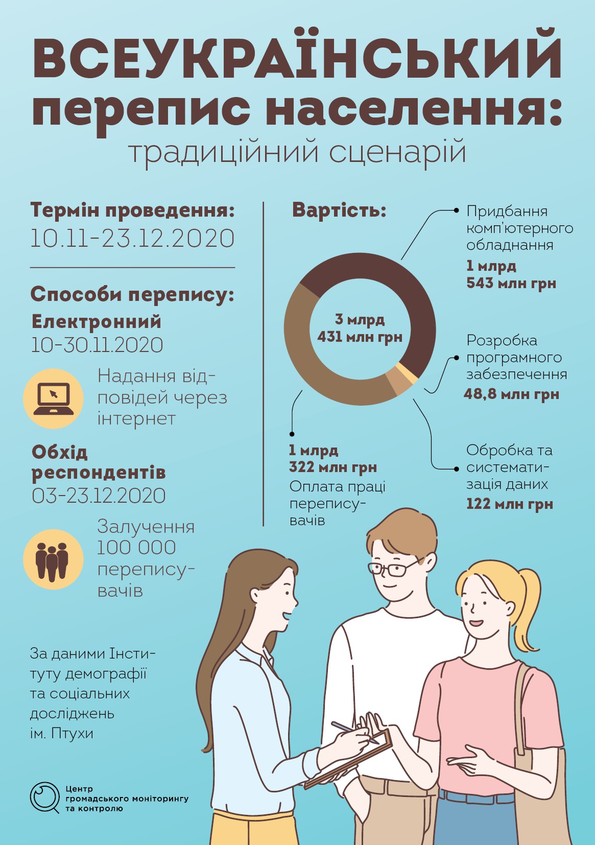 Власне, на перепис населення у держбюджеті заклали 3,431 млрд грн. Левова частка цих грошей призначалась на оплату роботи переписувачів, решта – на комп’ютерне обладнання та програмне забезпечення і обробку результатів. Втім, наразі в уряді вирішили зекономити і провести електронне опитування.