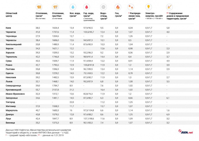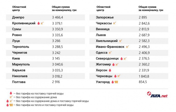 З урахуванням всіх платежів, сім’я з трьох осіб, які проживають в Дніпрі без лічильників, може заплатити за комуналку 3466 грн. Друге місце – Кропивницький, де без тарифу на утримання будинку і поставку гарячої води, фінальний платіж – 3 379,13 грн, далі йдуть Суми – 3350 грн. У топ-10 також входять: Рівне (3335 грн), Луцьк (3266 грн), Тернопіль (3288 грн), Чернігів (3242 грн), Київ (3 145 грн), Маріуполь (3 040 грн), а також Харків (3035 грн) і Миколаїв (3018 грн). Найменше платять в Ужгороді, де без тарифу за опалення і постачання гарячої води, комуналка – 854,5 грн. Трохи більше в Чернівцях – 1 840,8 грн (без платежу за утримання будинку та поставку гарячої води) і Херсоні – 2331,9 грн (без тарифу на тепло і поставку гарячої води) Однак, як зазначається, реальні комунальні платежі в Ужгороді, по заявою місцевих жителів, в зимовий період складають 1500-2000 грн. Основна витрата йде за газ і електроенергію, так як городяни активно використовують бойлери та котли. Ліга.нет